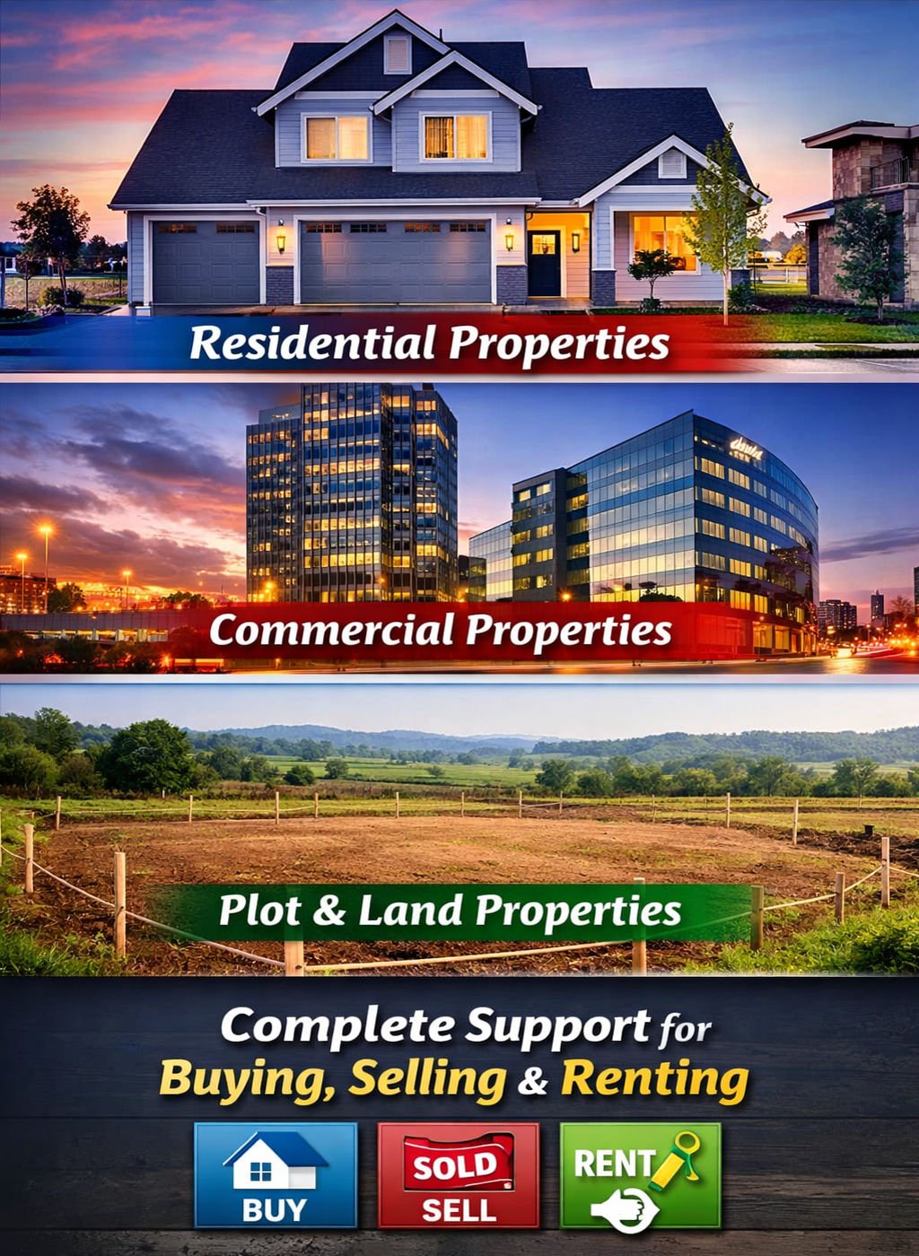 We specialize in residential, commercial, and plot & land properties, offering complete support for buying, selling, and renting.